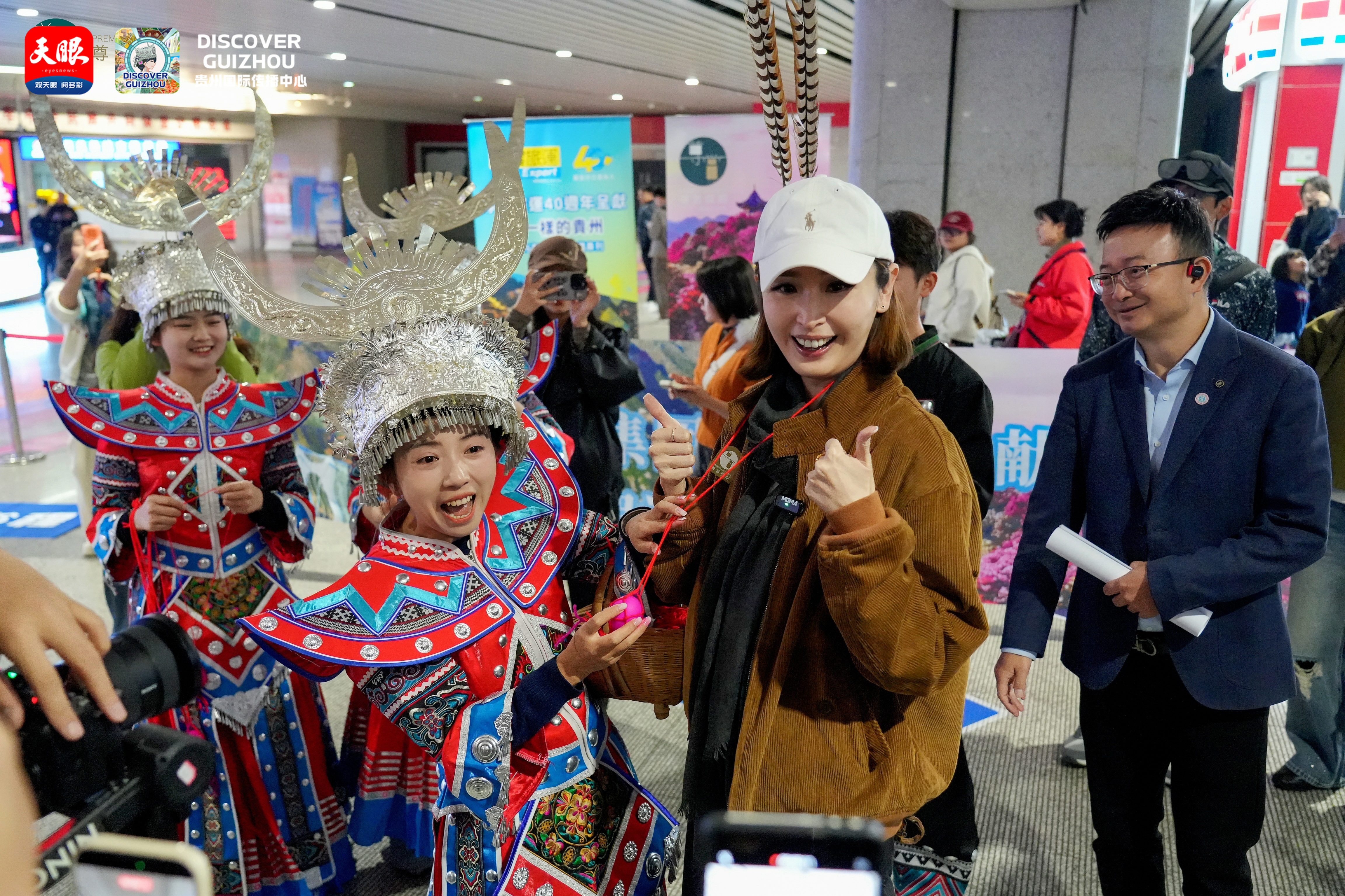 一下高鐵,游客們便感受到貴州舒適宜人的氣候與熱情好客的民俗,文明旅游形象大使們身著精美的民族服飾載歌載舞,用富有特色的傳統(tǒng)儀式迎接遠(yuǎn)道而來(lái)的香港游客,向他們展示貴州“文化千島”“民族生態(tài)博物館”的獨(dú)特魅力?!耙路系拇汤C圖案、頭頂戴的苗族銀飾都非常好看,還貼心準(zhǔn)備了很有寓意的伴手禮,讓人更加期待接下來(lái)的旅途。”香港游客關(guān)先生說(shuō)。