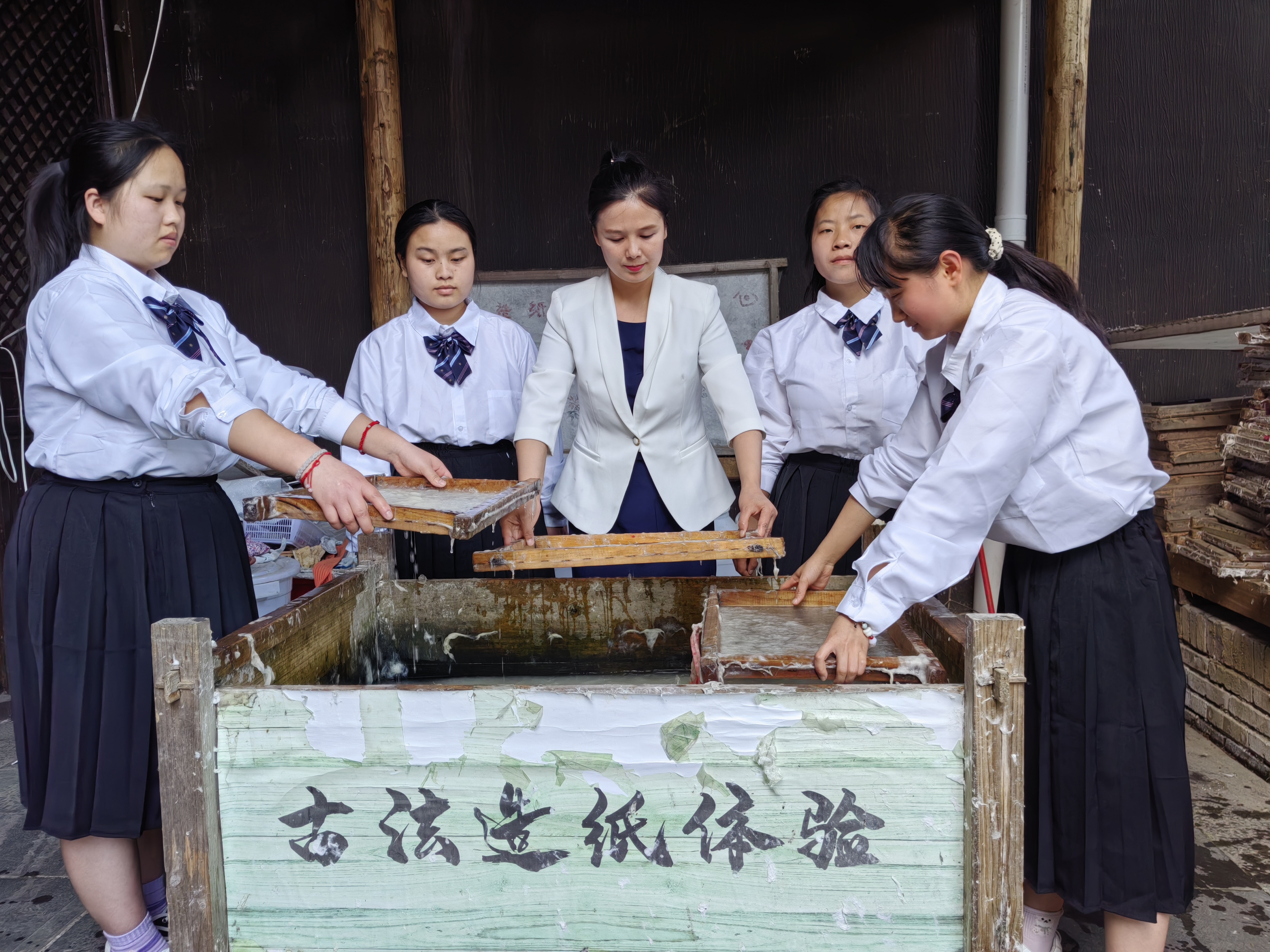 黎雪飛帶領(lǐng)學(xué)生體驗(yàn)非遺——石橋古法造紙