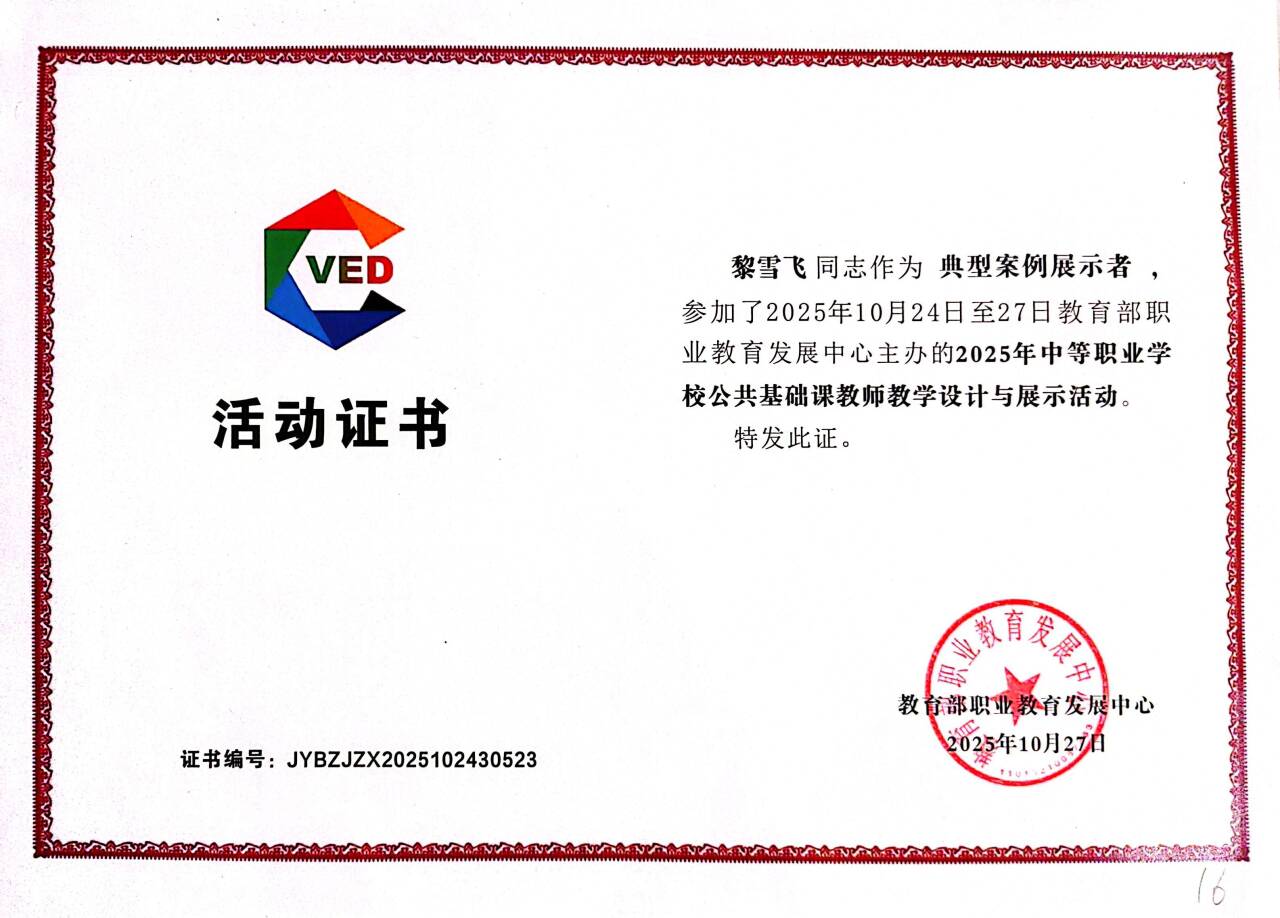 今年10月,2025年全國(guó)中等職業(yè)學(xué)校公共基礎(chǔ)課教師教學(xué)設(shè)計(jì)與展示活動(dòng)在青島舉行。黎雪飛在歷史組競(jìng)賽中表現(xiàn)出色,獲得最高榮譽(yù)“典型案例”稱號(hào)。